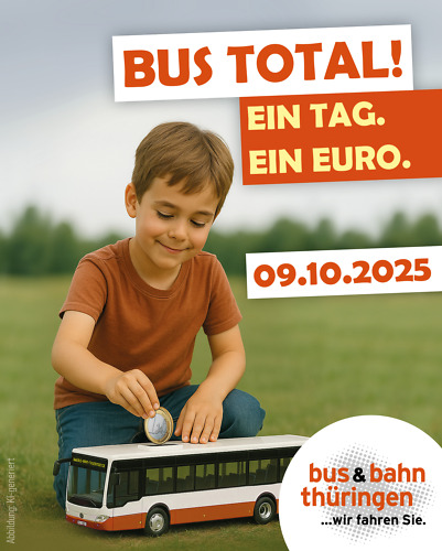 Am 09. Oktober 2025 ist es wieder soweit! Zum Aktionstag „Bus total! Ein Tag! Ein Euro!“ können Fahrgäste für nur einen Euro den ganzen Tag die Linien von 15 Busunternehmen in neun Landkreisen nutzen und unterwegs sein!